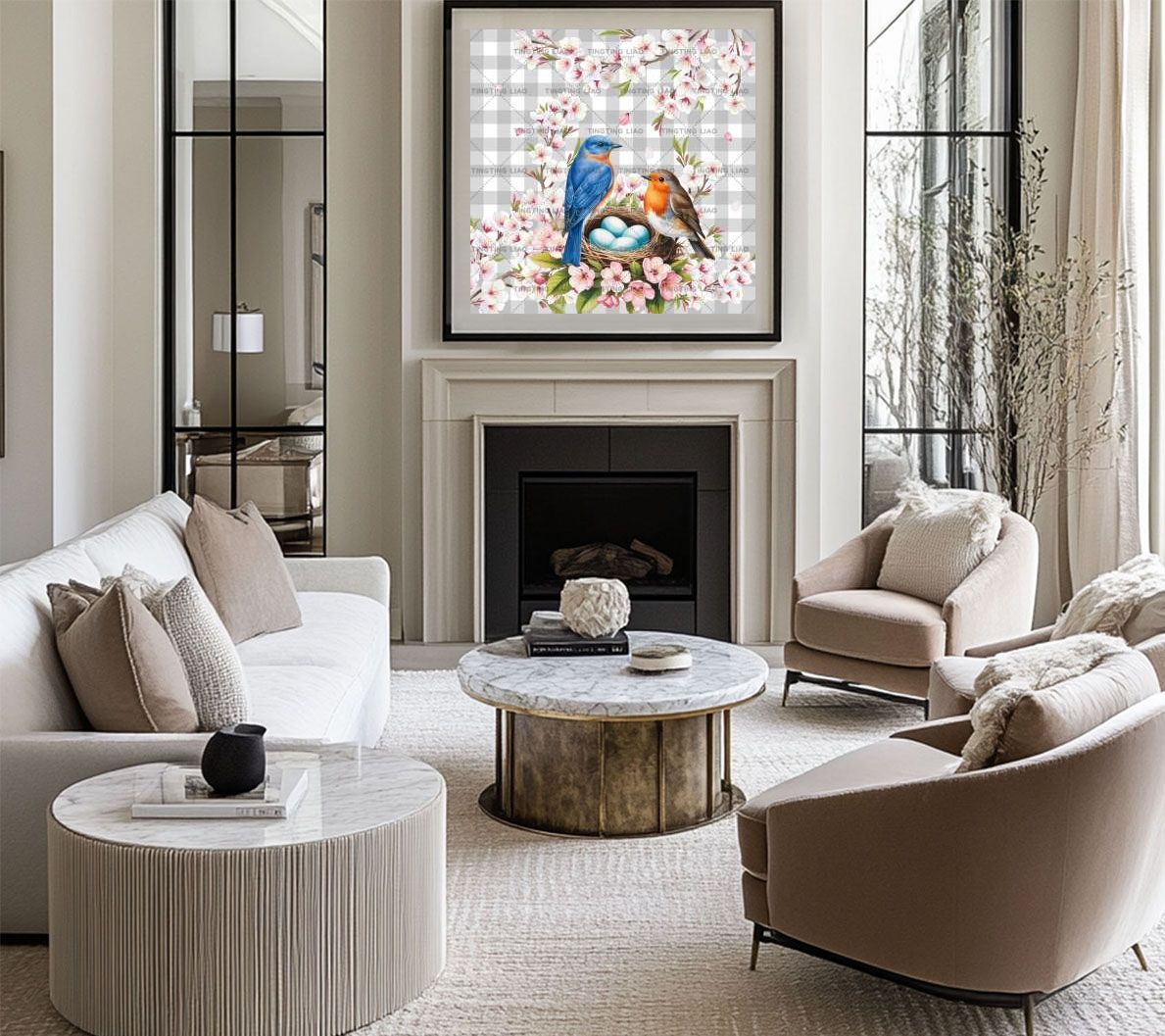 Spring,Birds,Flowers,Bird Nests,Watercolors,Grey Stripes