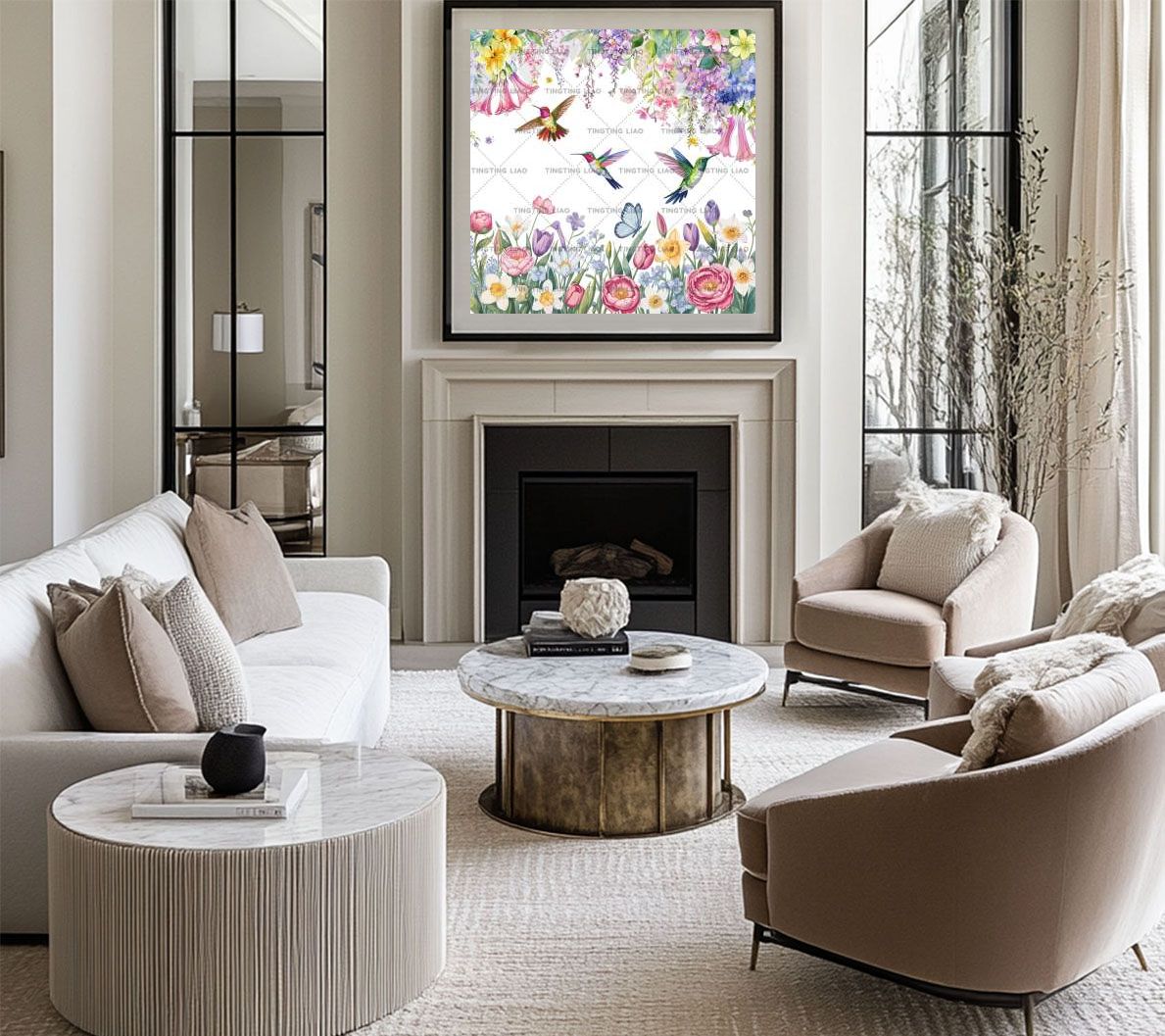 Spring,Flowers,Purple Vineflowers,Tulips,Honeybirds,Watercolor Style