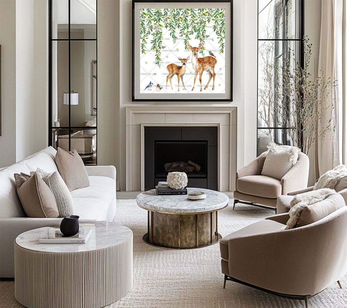 Spring,Flowers,Plants,Deer,Birds,Watercolor