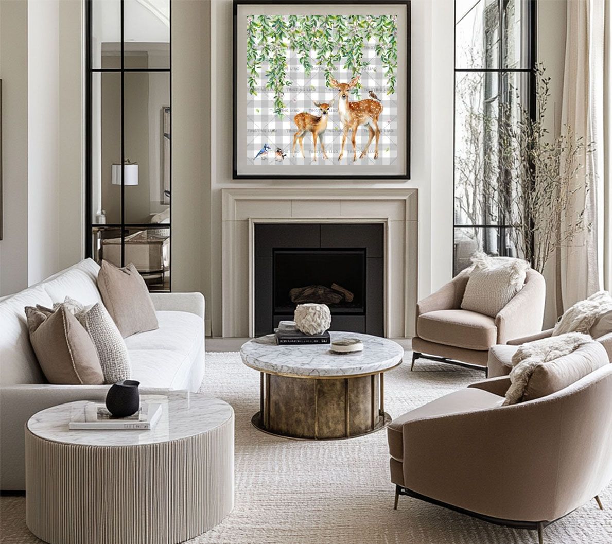 Spring,Flowers,Plants,Deer,Birds,Watercolors,Grey Grains