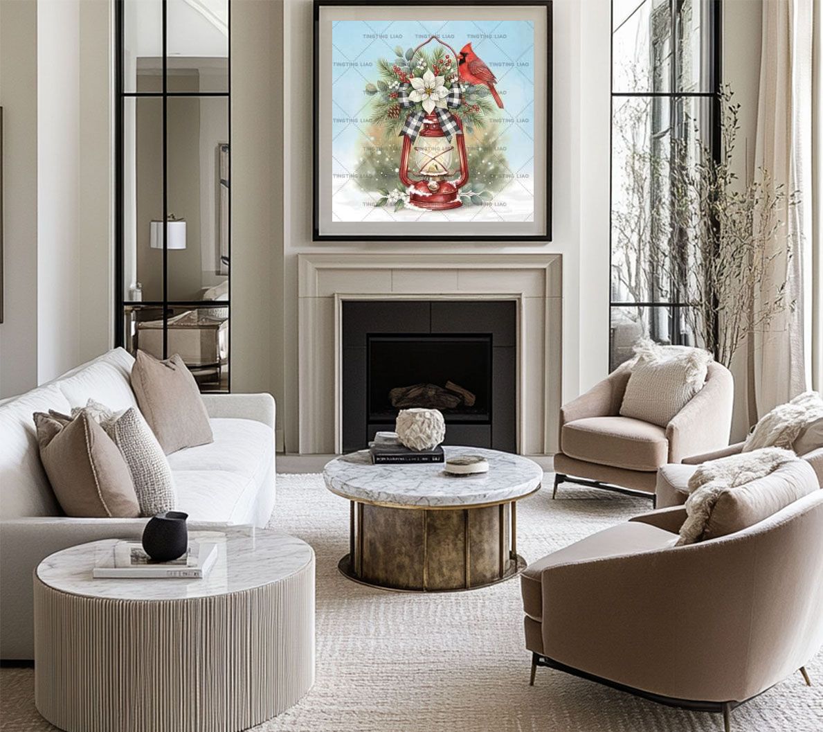 Christmas,Kerosene Lamp,Cardinal Bird,One Red,Pine Needle,Watercolor,Art,Decoration