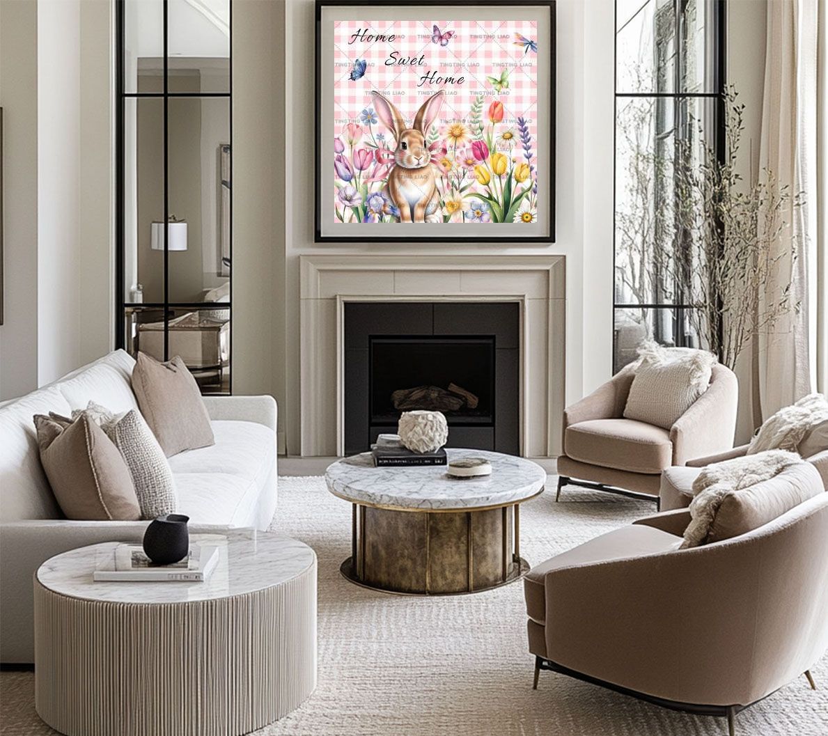 Spring,Flowers,Rabbits,Tulips,Daisy,Dragonflies,Butterflies,Text,Watercolor,Pink Ribbon
