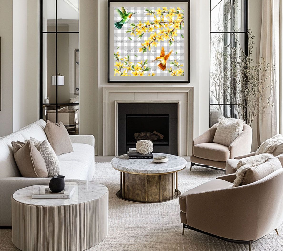 Spring,Flowers,Spreaded Flowers,Birds,Leaves,Watercolors,Light Grey Stripes