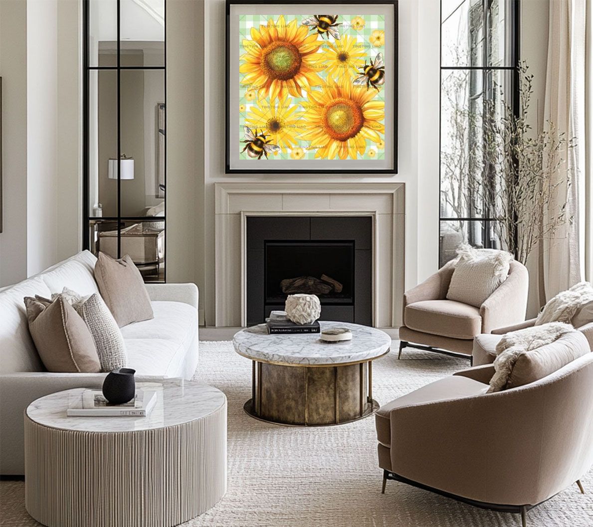 Spring,Sunflowers,Daisy,Small Flowers,Bees,Watercolors,Fields,Light Green Ribbons