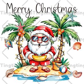 Christmas,Santa Claus,Ocean,Beach,Coconut Tree,Shell,Starfish,Watercolor Style