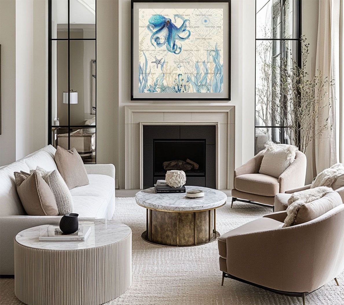 Oceans,Sea Stars,Jellyfish,Shells,Bubbles,Octopus,Watercolor,Retro