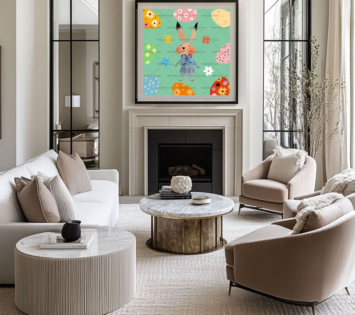 Spring,Easter,Eggs,Rabbit Little Flowers Series,Green Background
