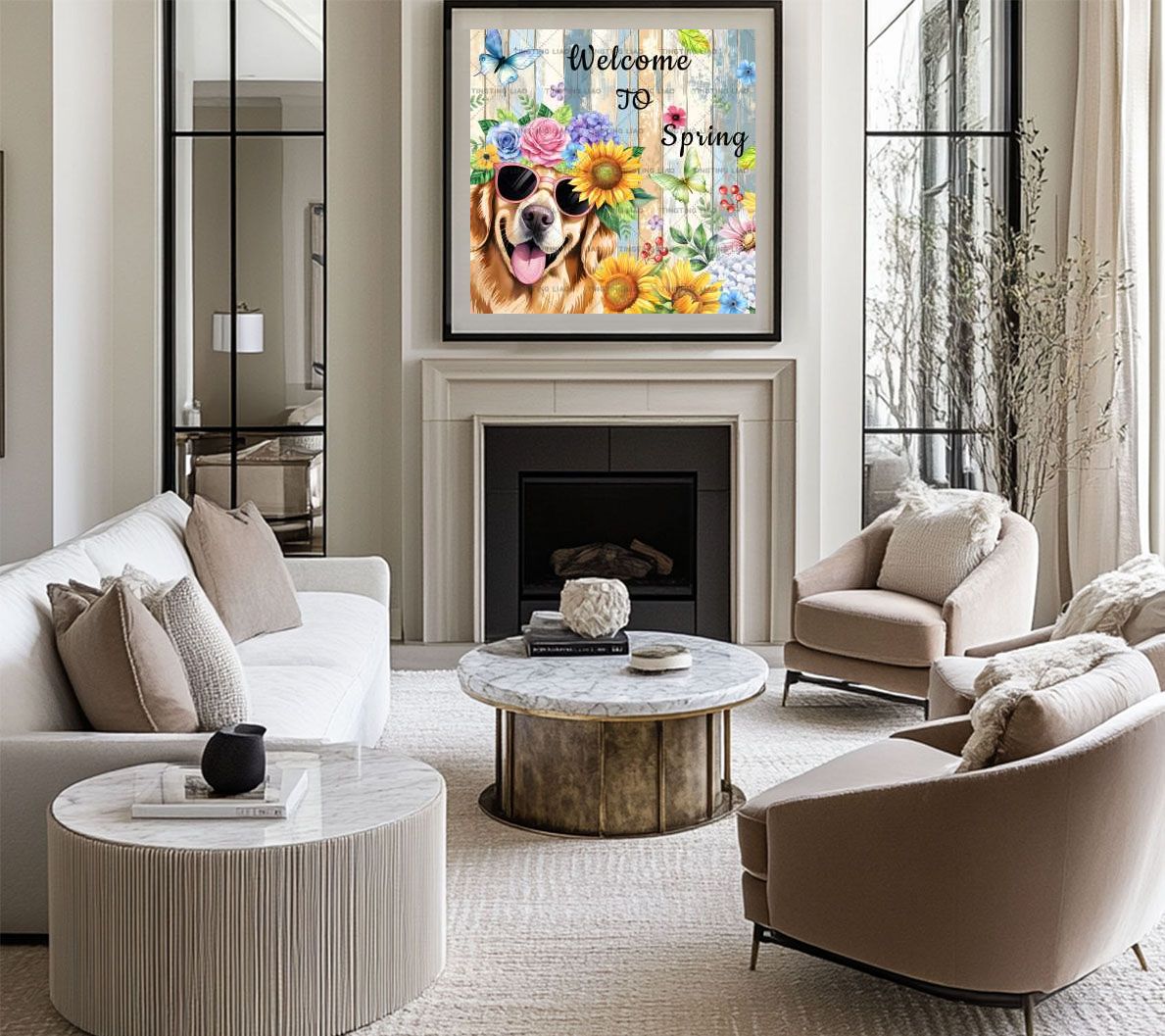 Spring,Dogs,Flowers,Sunflowers,Roses,Embroidered Balls,Butterflies,Watercolors,Text,Colored Wooden Stripes