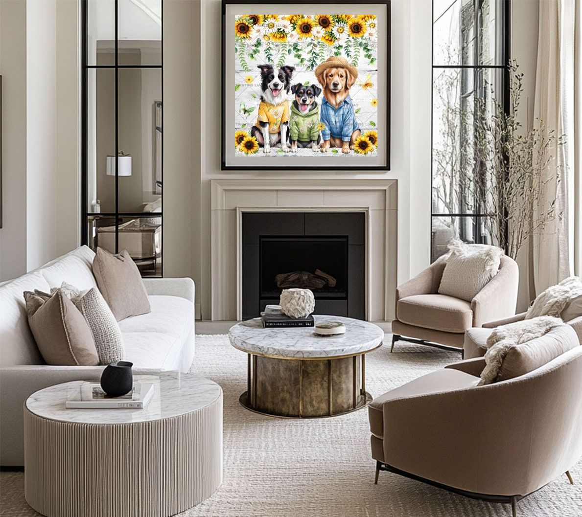 Spring,Dogs,Sunflowers,Daisy,Leaflets,Watercolors,Fields,Woodcuts