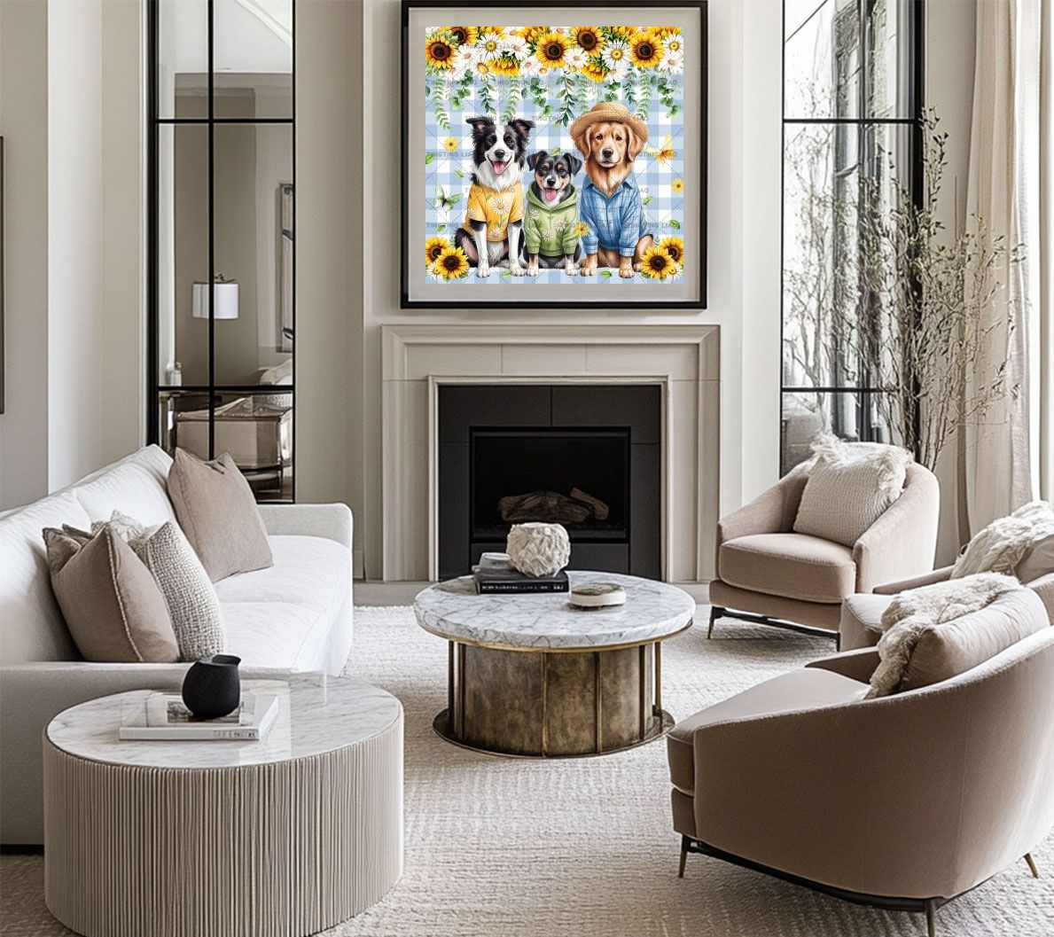 Spring,Dogs,Sunflowers,Daisy,Leaflets,Watercolors,Fields,Pale Blue Stripes