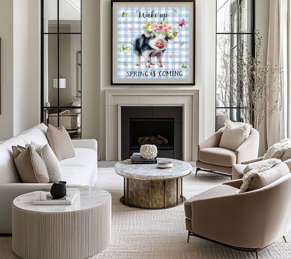 Spring,Pigs,Roses,Daisy,Butterflies,Leaflets,Text,Watercolor,Light Blue Ribbon