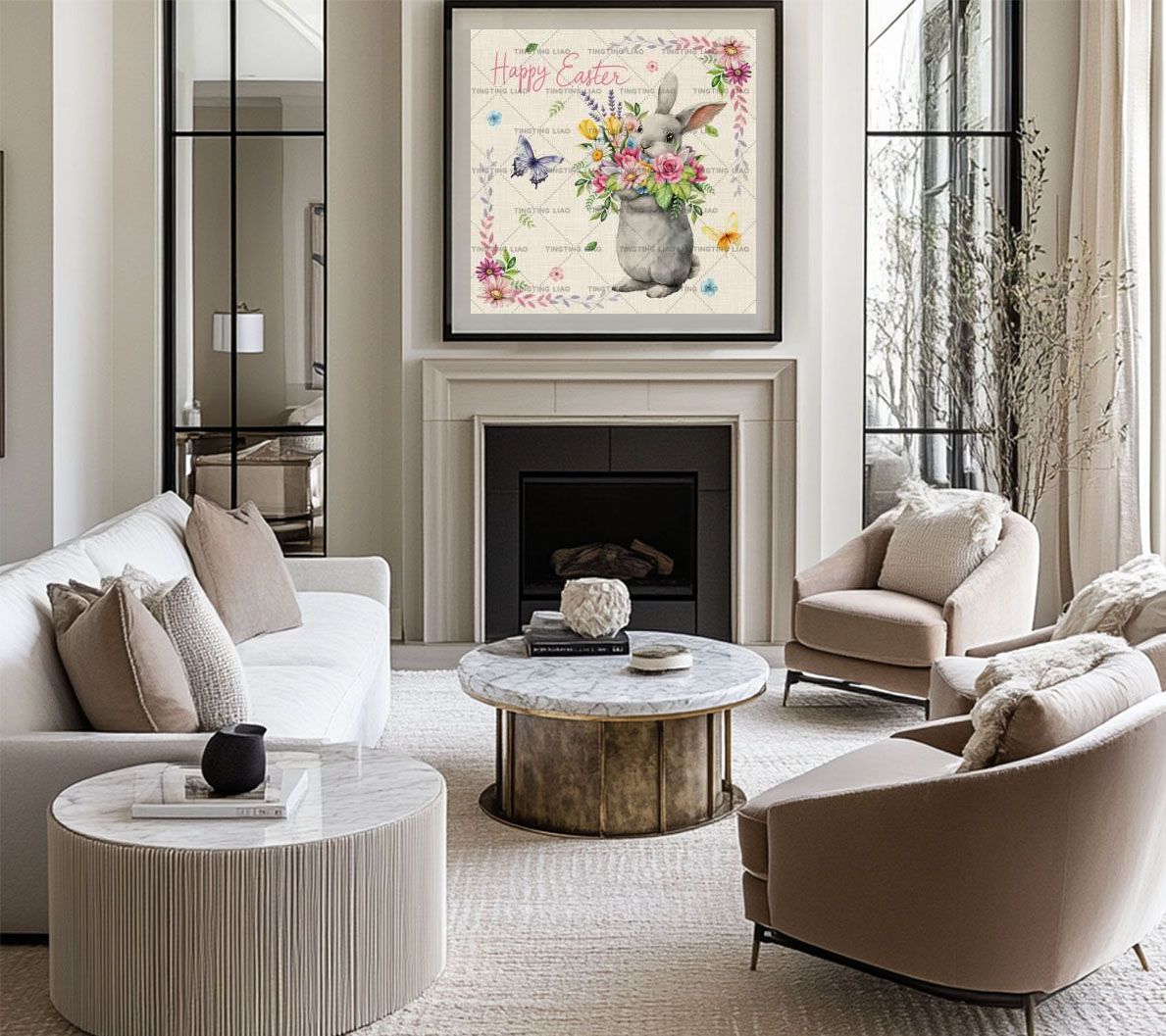 Easter,Rabbits,Flowers,Butterflies,Spring,Text,Leaves,Watercolor,Sackcloth