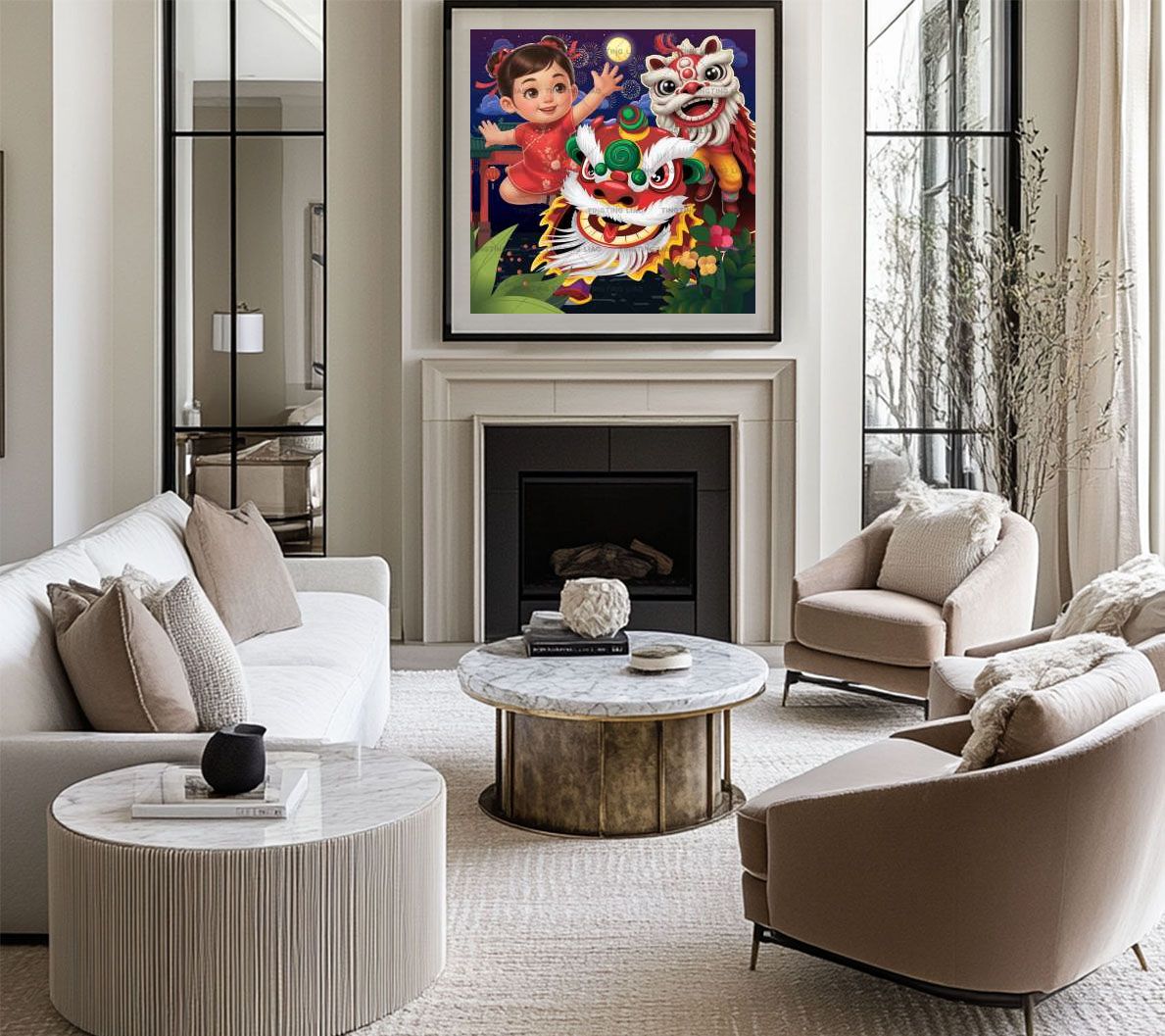 Happy New Year,Dance Lions,Fireworks,Art,Decoration,Retro