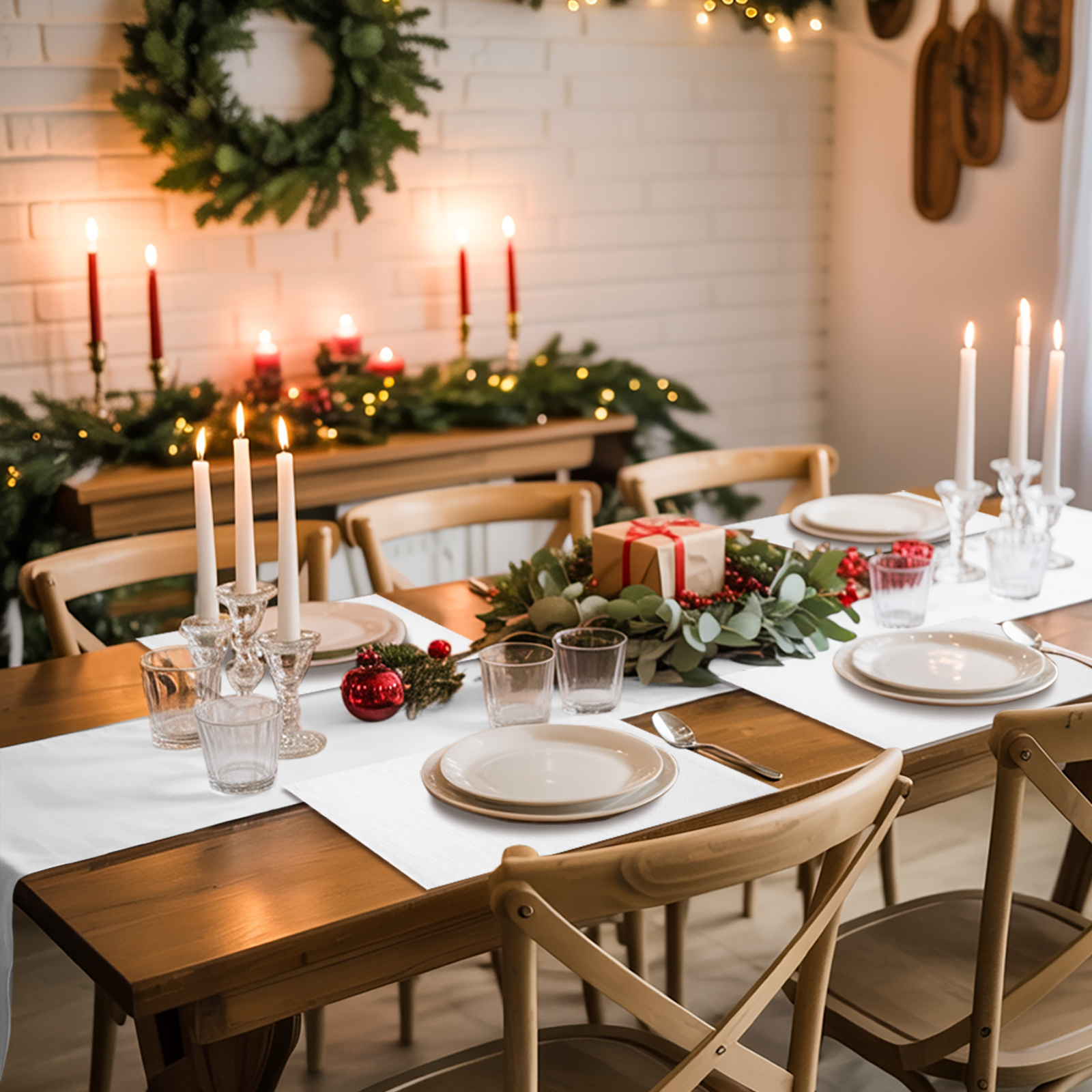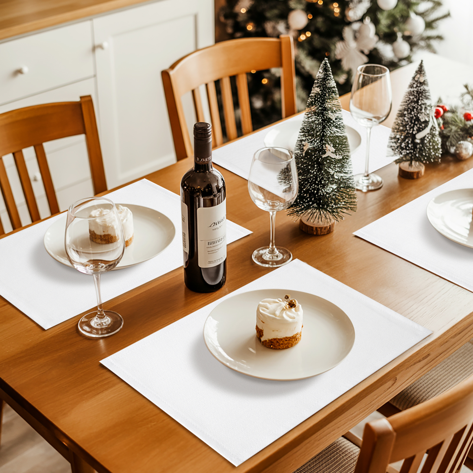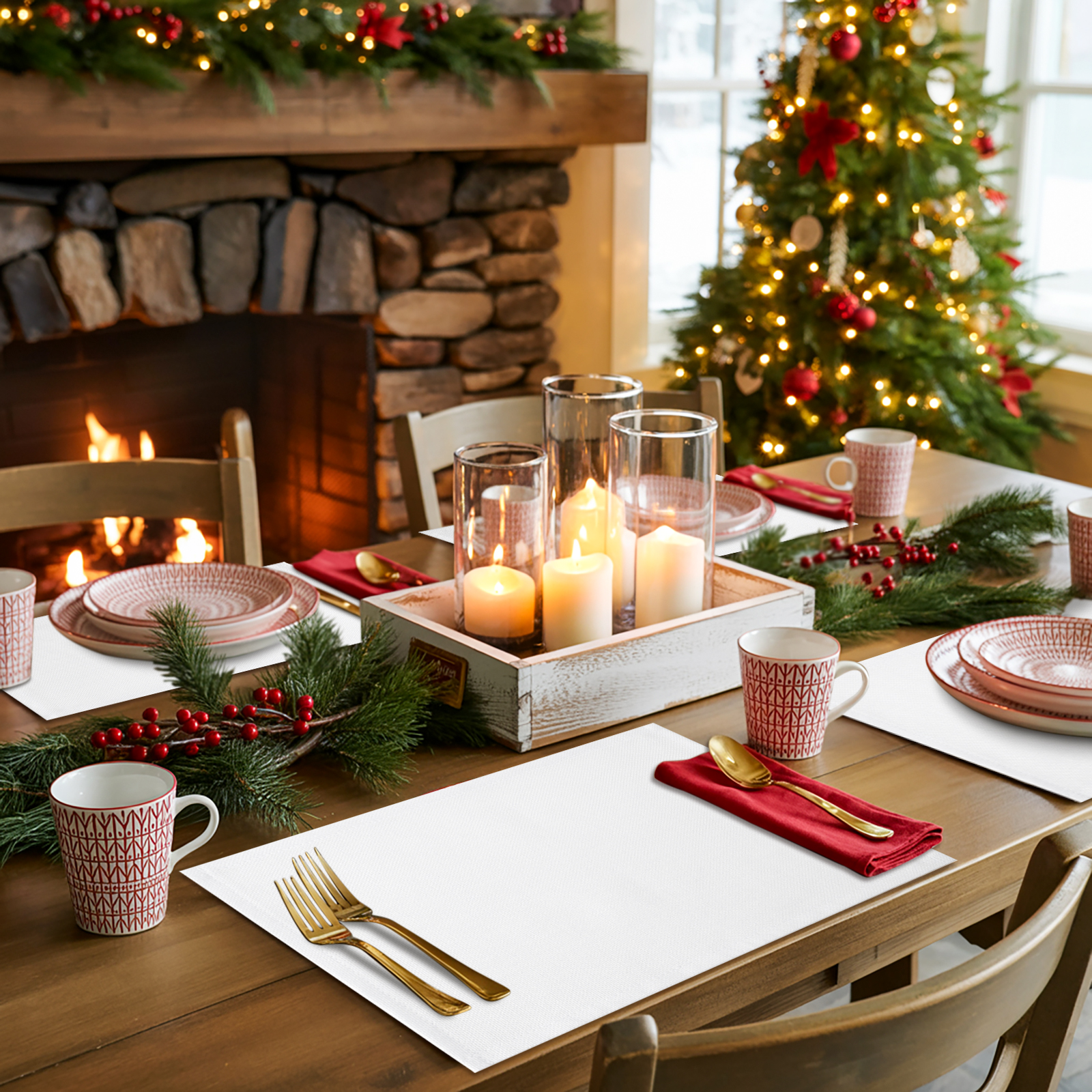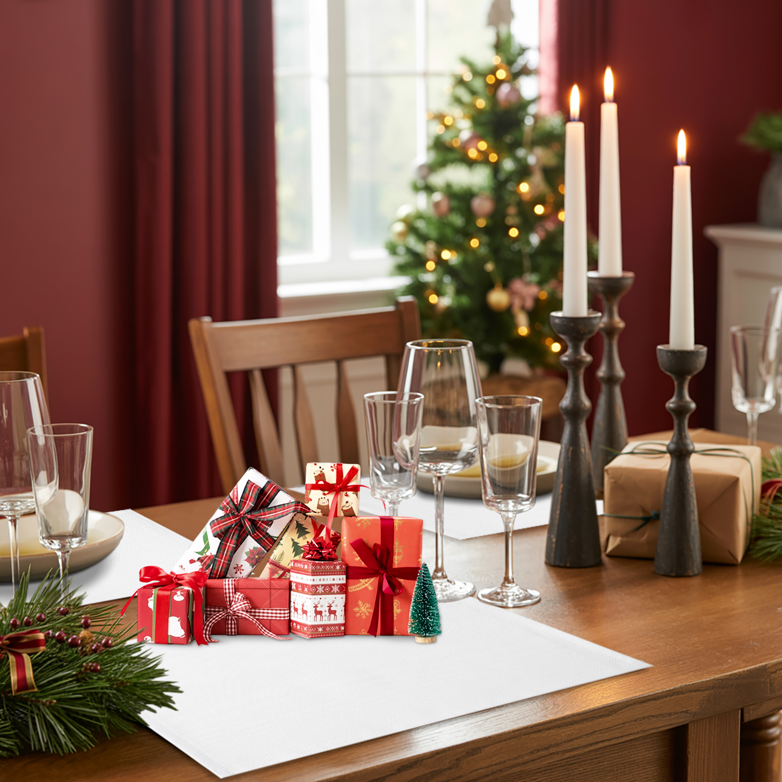 White windows and white window treatment valances, with Christmas snow scene outside the window