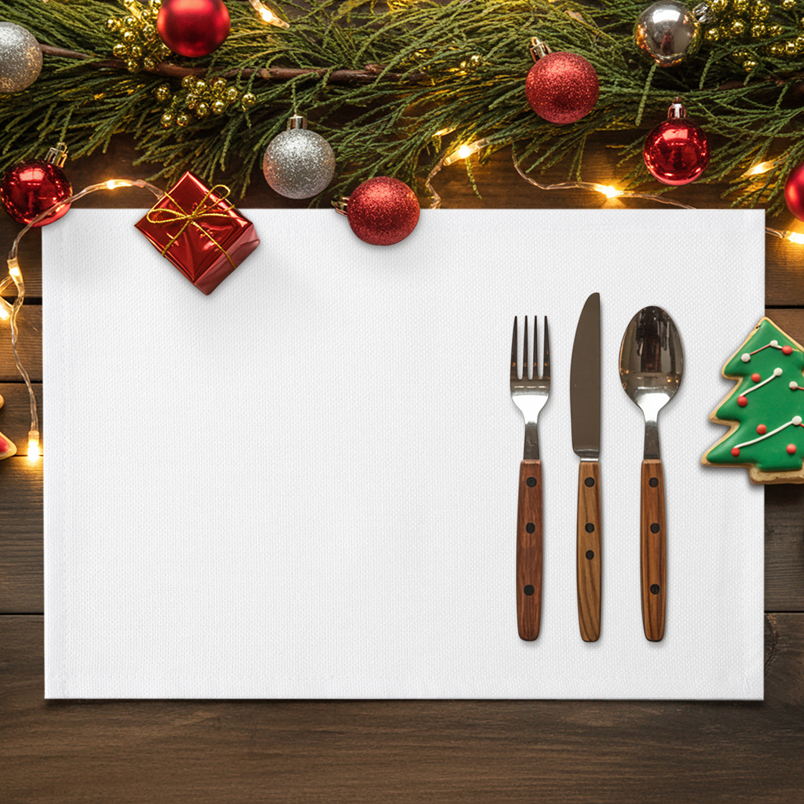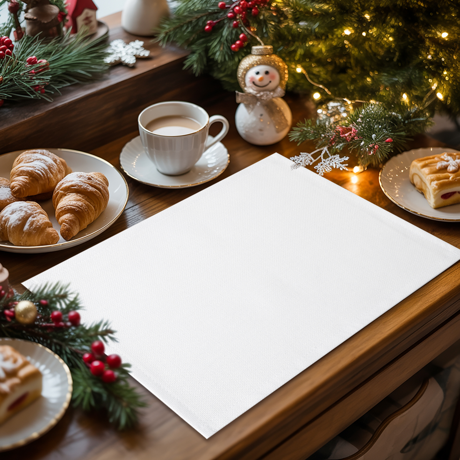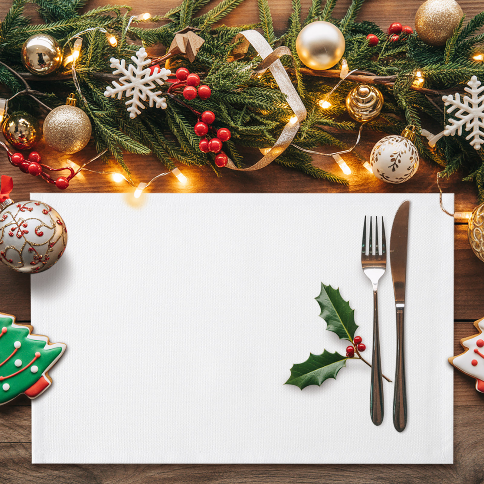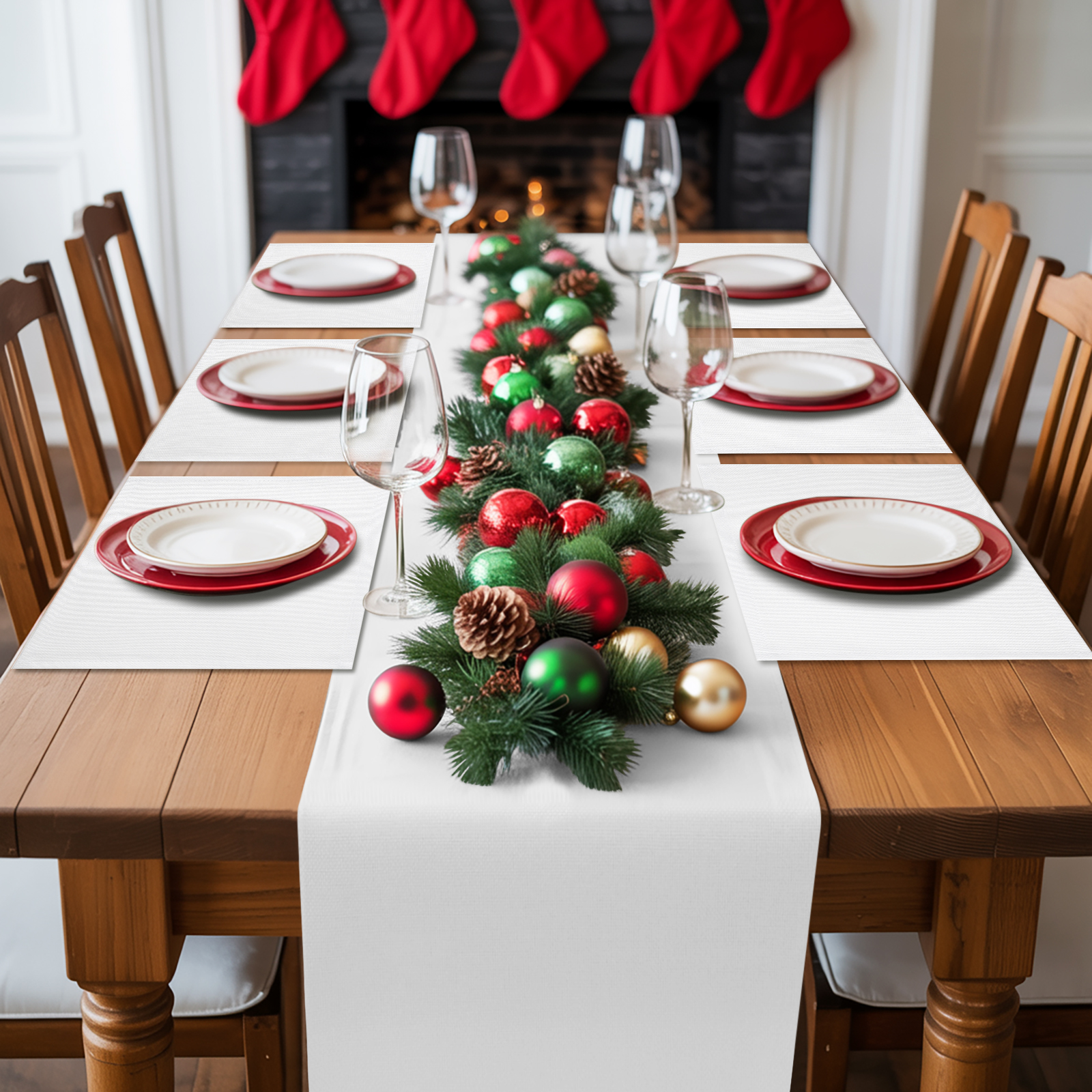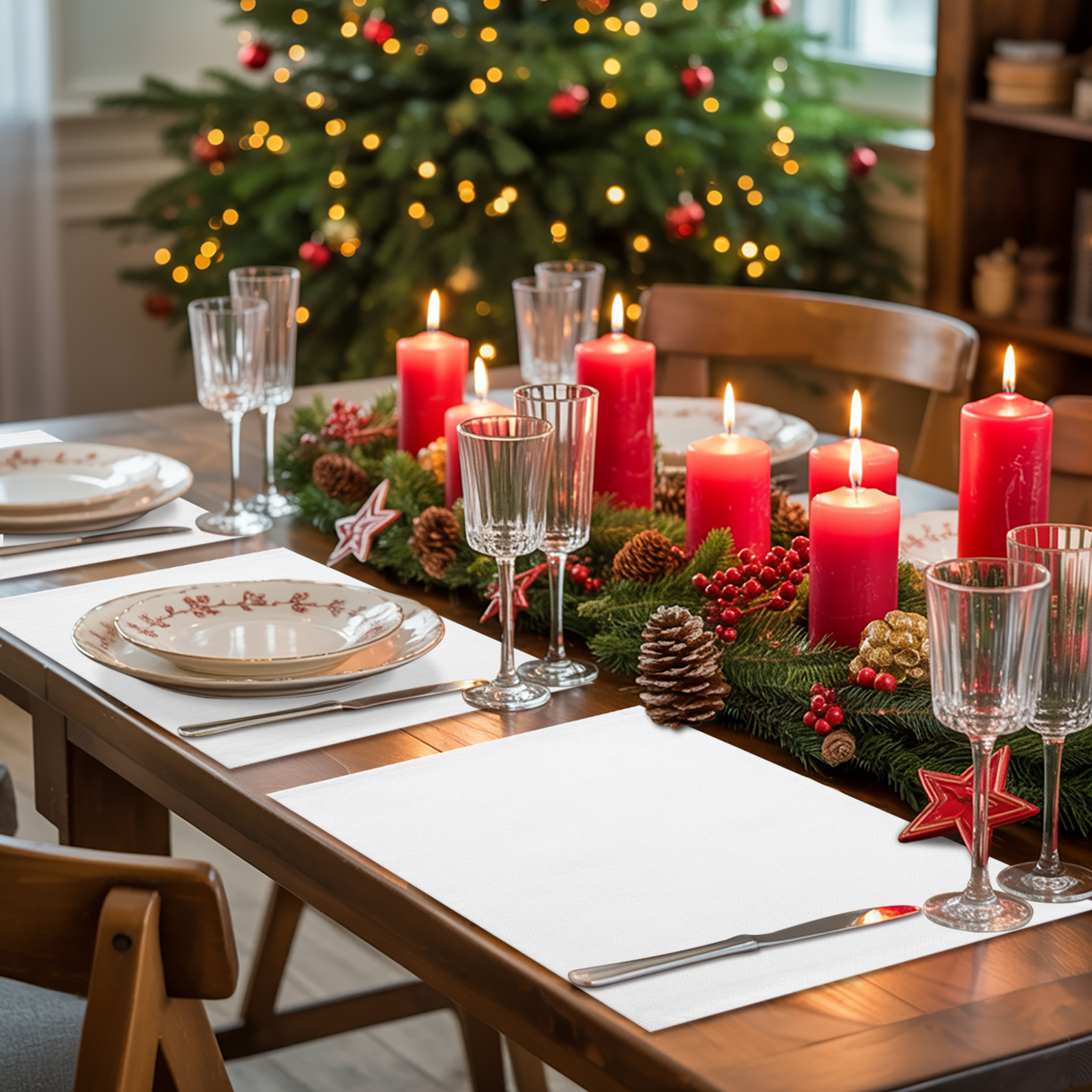 White windows and white window treatment valances, with Christmas snow scene outside the window
