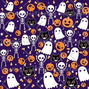 Halloween,Ghost,Pumpkin,Candy,Black Cat,Skull,Retro,Purple Background