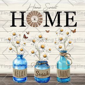 There are three vases with daisies on the wood grain and HOME is written on the board.