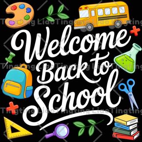 Back To School Season,Campus,Cartoon,Children's Fun,Bus,Schoolbag,Book,Magnifying Glass,Ruler,Scissors,Plant,Text,Welcome Back To School,Black Background
