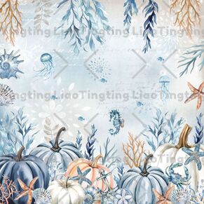 Thanksgiving,Autumn,Coastal,Pumpkin,Starfish,Shell,Coral,Blue Background