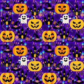 Halloween,Ghost,Pumpkin,Candy,Hat,Spider Web,Castle,Cartoon,Cute,Purple Background