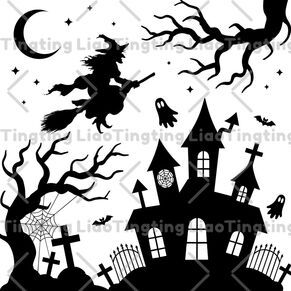 Halloween,Castle,Moon,Ghost,Bat,Witch,Spider Web,Cartoon