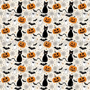 Halloween,Cat,Pumpkin,Spider Web,Ghost,Bat,Stars,Cream Background