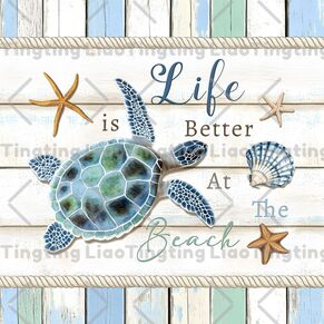 Sea turtle, starfish and shells on wooden board with the words life is better at the beach