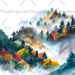 Autumn,Forest,Fog,Watercolor