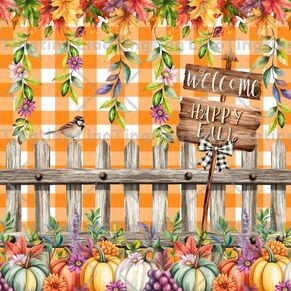 Autumn,Maple Leaf,Pumpkin,Fruit,Sparrow,Wildflower,Fence,Text,WELCOME HAPPY FALL,Plaid