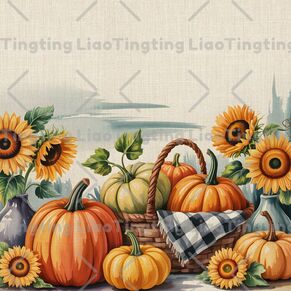Autumn,Thanksgiving,Pumpkin,Flower,Vintage Style,Sunflower,Bamboo Basket,Watercolor Style