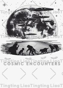 Moon,UFO,Mysterious Creature Silhouette,Classic Style,Retro Style,Animal Theme,Classic Pattern,Black And White Color,Sci-fi Elements,Cosmic Atmosphere