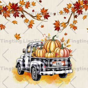 Thanksgiving watercolor style autumn leaves and truck with pumpkins