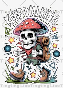 Cartoon,Illustration,Back,Luggage,Skull,Mushroom Hat,Boots,Belt,Grass,KEEP WALKING,Bone