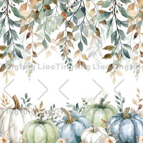 Watercolor style eucalyptus leaves and blue, green and white pumpkins 2