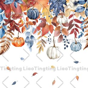Blue, white and orange pumpkins hanging from blue eucalyptus and orange leaves