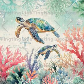 Watercolor,Hand-painted,Summer,Turtle,Coral,Marine Life,Blue,Seabed
