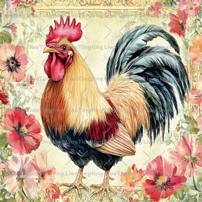 Vintage,Farm,Watercolor,Rooster,Chicken,Texture,Flowers