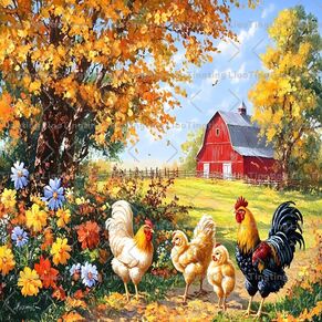 Vintage,Farm,Watercolor,Rooster,Chick,Flowers