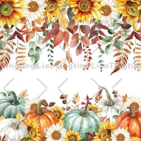 Sunflowers and eucalyptus leaves and orange leaves White pumpkin Green pumpkin and orange pumpkin and sunflowers and leaves