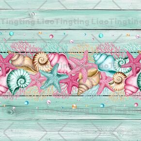 Summer,Beach,Marine Life,Watercolor,Pink Starfish,Shell,Coral,Vintage,Green Wood Grain