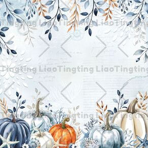 Watercolor style blue pumpkins, blue eucalyptus leaves, starfish and shells