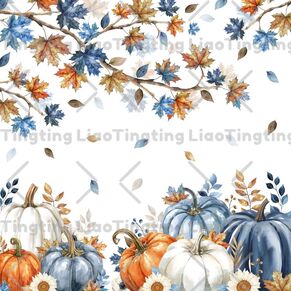 Watercolor style blue pumpkin and blue eucalyptus leaves 3