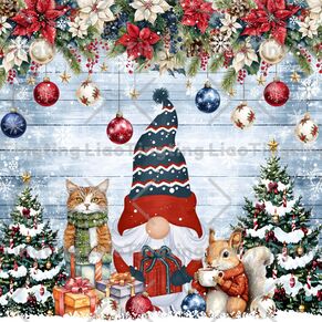 Christmas,Gnome,Christmas Tree,Poinsettia,Squirrel,Cat,Blue Wood Grain