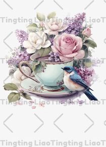 Vintage Tea Cups,Flowers,Birds,Watercolor Style,Utensils