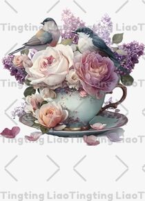 Vintage Tea Cups,Flowers,Birds,Watercolor Style,Utensils