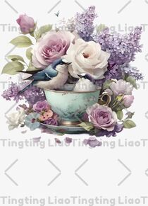 Vintage Tea Cups,Flowers,Birds,Watercolor Style,Utensils