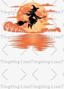 Orange,Black,White,Yellow,Art,Classic,Fantasy,Nature,Witch Riding Broom,Moon,Bats,Trees,City,River