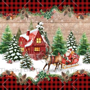 Christmas,Santa Claus,Sled,Reindeer,Cottage,Forest,Christmas Tree,Winter,Snowflakes,Plants,Stripes,Woodcuts