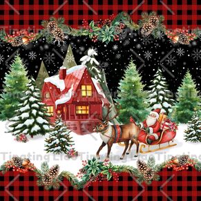 Christmas,Santa Claus,Sled,Reindeer,Cottage,Forest,Christmas Tree,Winter,Snowflakes,Plants,Stripes,Black