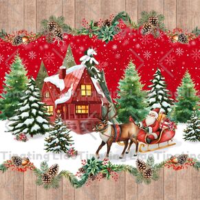 Christmas,Santa Claus,Sled,Reindeer,Cottage,Forest,Christmas Tree,Winter,Snowflakes,Plants,Woodcuts,Red